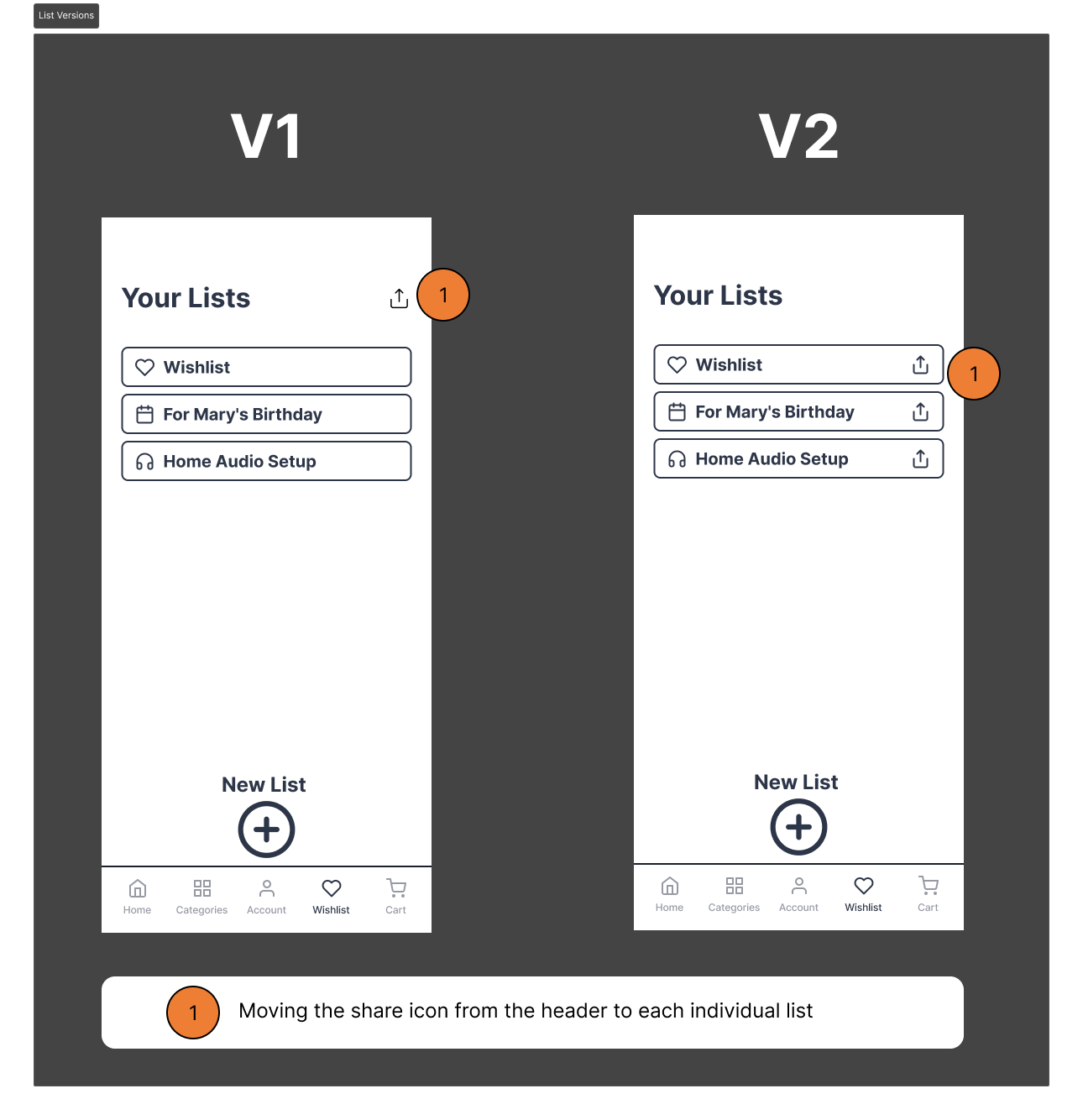 Version 1: Share button being tucked inside of lists took too much time to reach and back out of