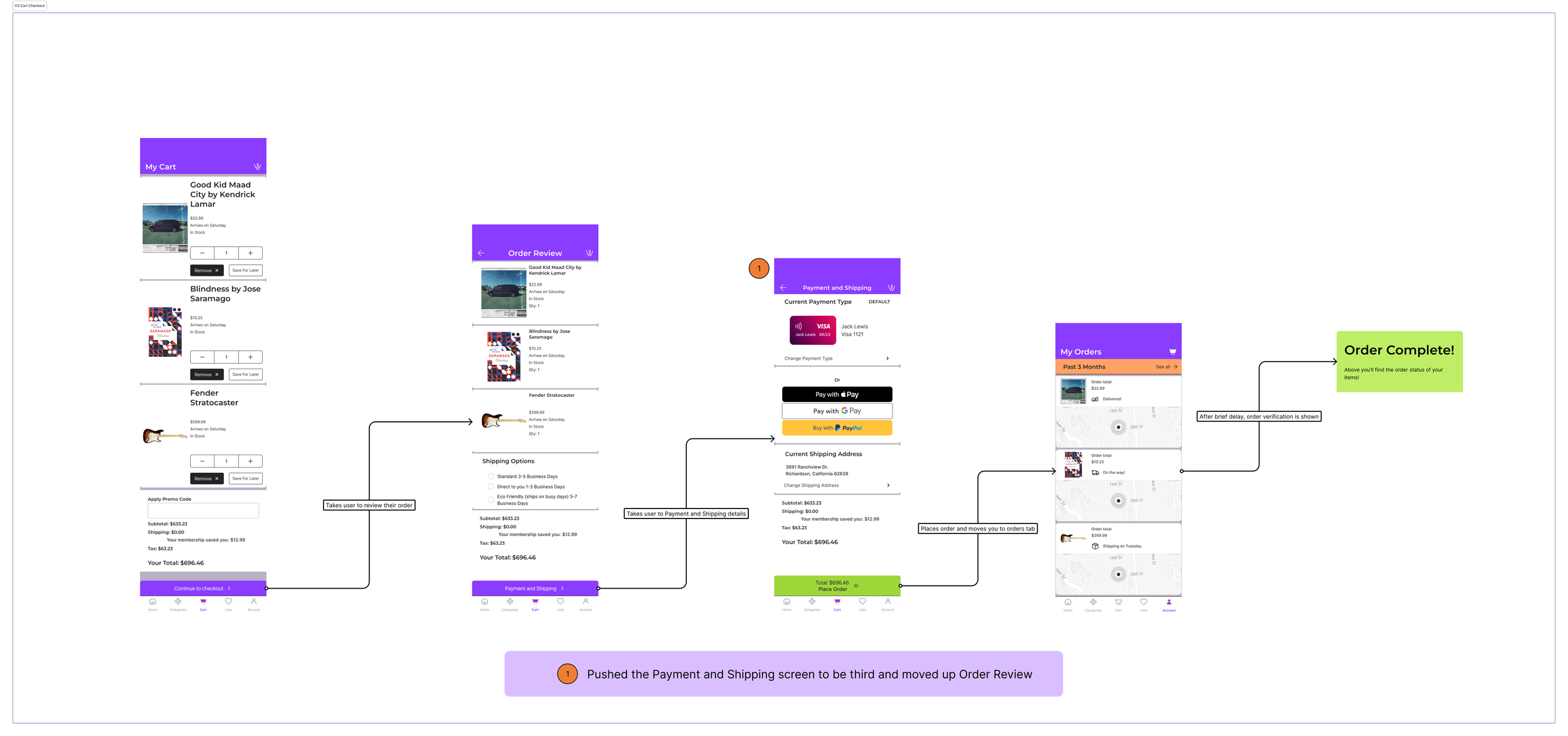 This one shifted the first screen post cart to be the order review and the second to be verifying your payment and shipping.