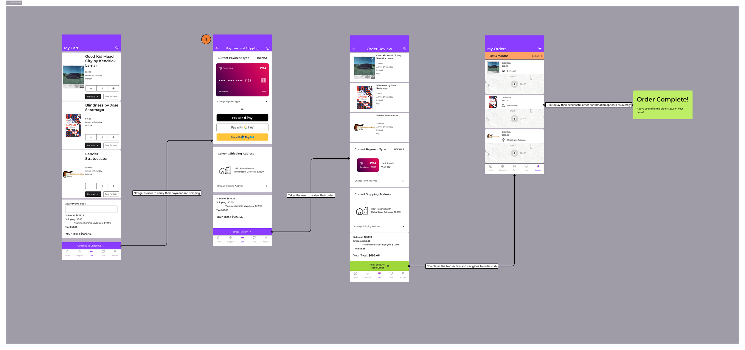 MVP and Final Version: Moving the virtual wallet one screen further into the flow while making the order review clearer and using screen real estate improved both form and function placing this design in a usable state